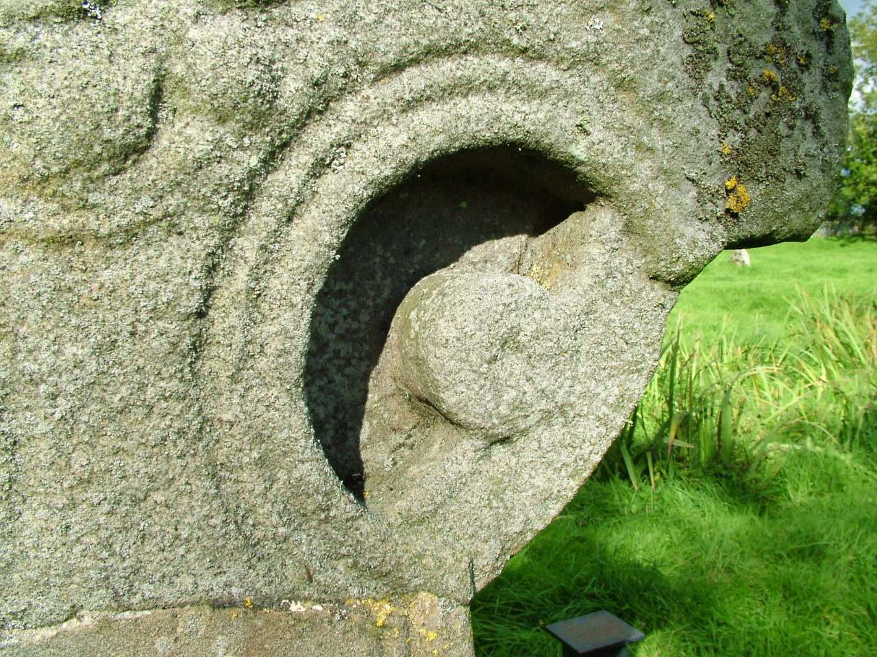 The south side has a pattern of 'bossed spirals'. On the north side, fine overall interlace creates a cross at the centre.