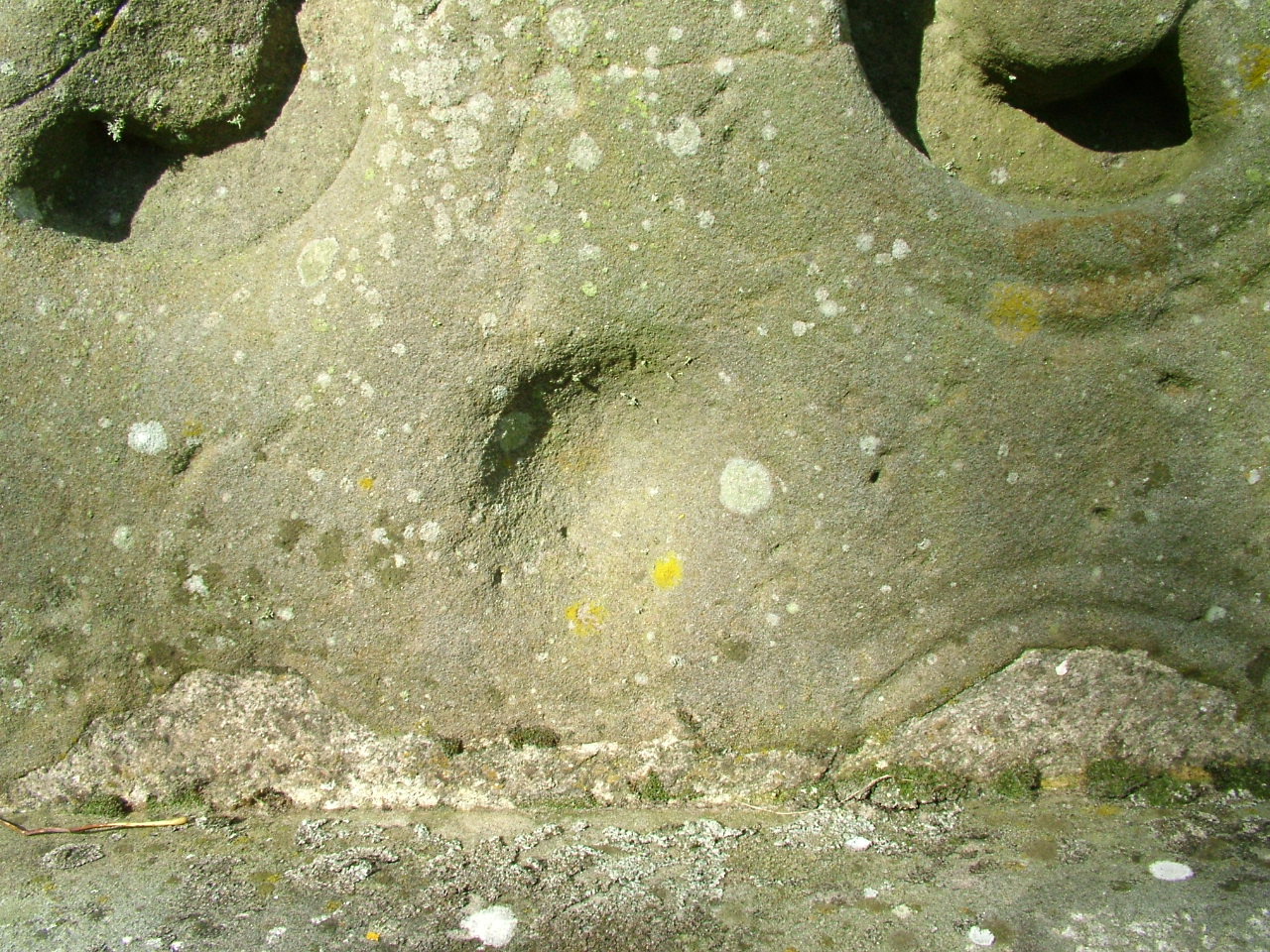 Information: First noted in 1930, lying loose in the graveyard, it is now mounted on a stone plinth. The broken Cross-Head is similar in form to the North Cross, but at the head the edge moldings run off the top and there is the stump of a broken tenon, clear signs that the cross originally had a separate stone finial.