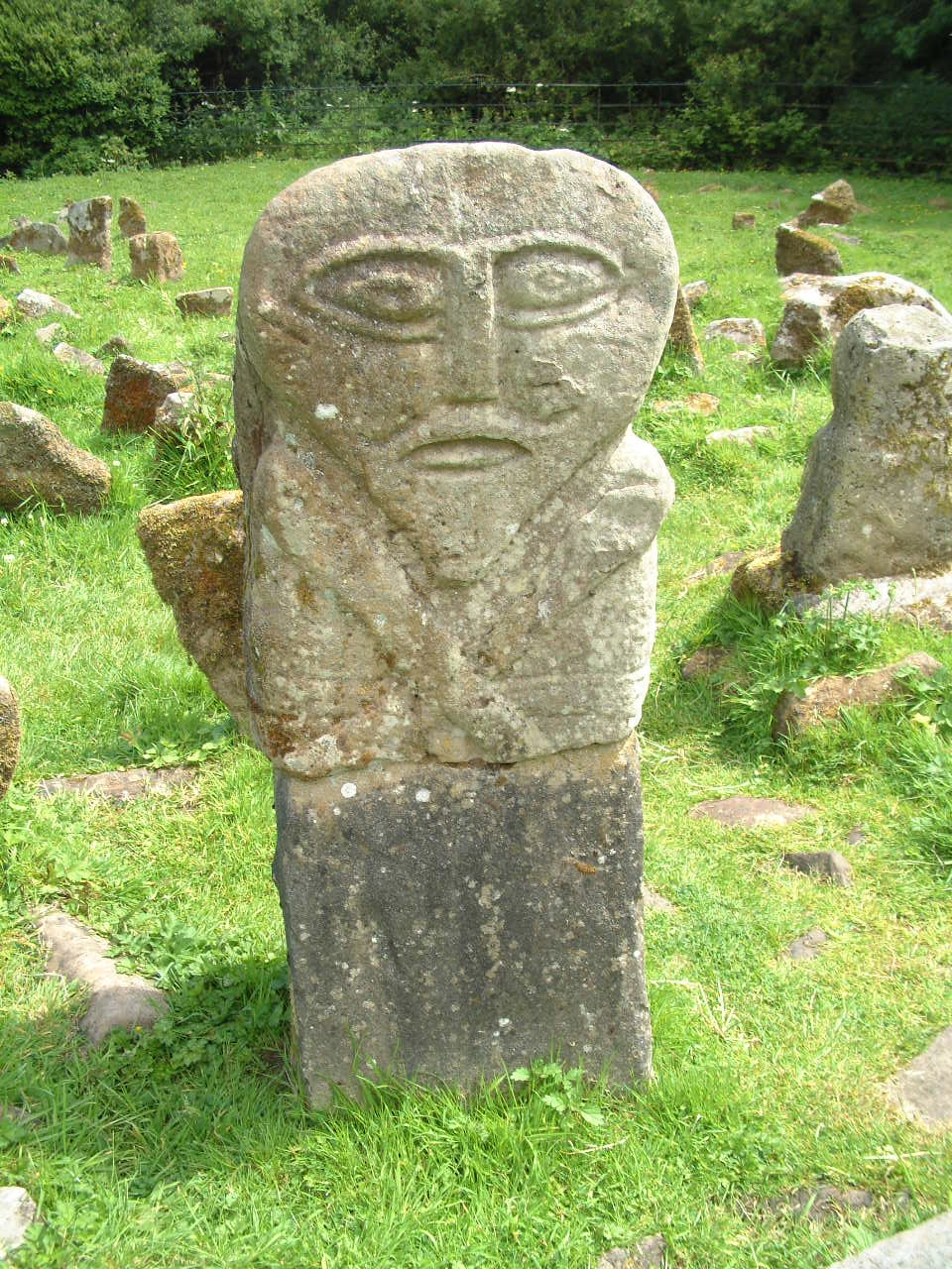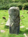 Description: The remains of this Decorated Stone has been mounted on a new stand. No-one is sure of the origins of these 2 decorated stones both of which have carved figures on them.